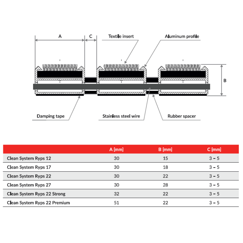 Ștergătoarele Clean Ryps sunt construite pentru utilizare profesională continuă și sunt asamblate cu cabluri din oțel inoxidabil, care creează o structură deschisă. Aceasta permite murdăriei să cadă în locașul dedicat (gully), menținând suprafața de pășire permanent curată și funcțională.